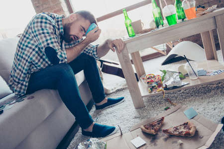 Young drunk handsome man after party at home