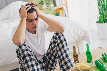 Young man in sleepwear sitting on the floor showing signs of stress and discomfort in a cozy bedroom environment during daytime.