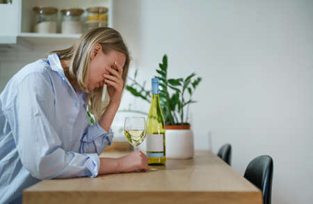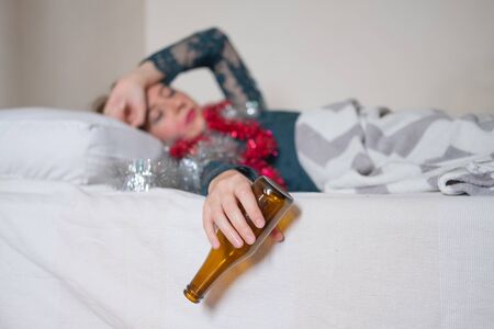 Woman suffering from depression and drinking alcohol.