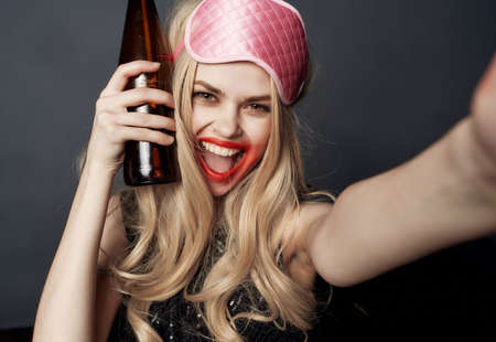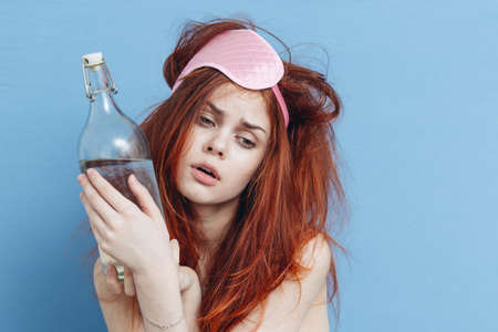 emotional red-haired woman with sleep mask hangover alcohol bottle in hands