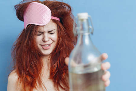 woman with red hair bottle alcohol hangover sleep mask blue background