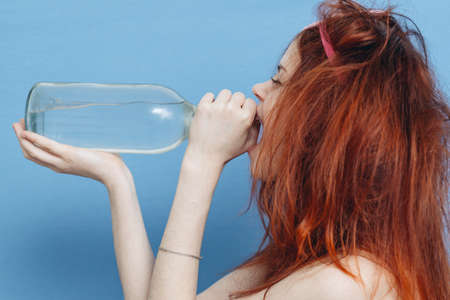 drunk woman with red hair bottle near face for alcohol holiday
