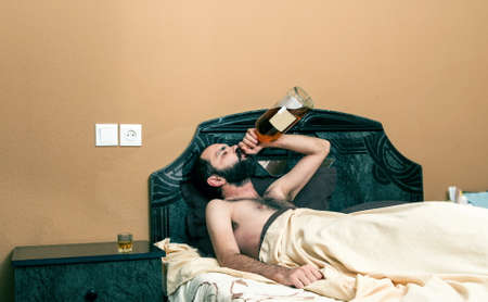 Funny drunken man in the bedroom