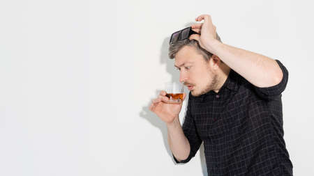 young drunk wasted and messy man drinking whiskey glass depressed and sad suffering alcohol addiction problem isolated on dark background in dramatic light in alcohol abuse concept