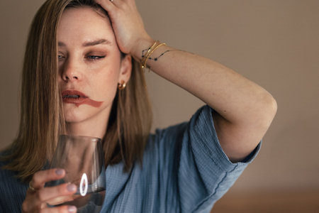 Portrait of depressed woman with glass of wine.