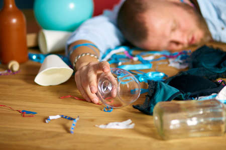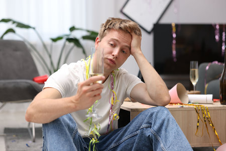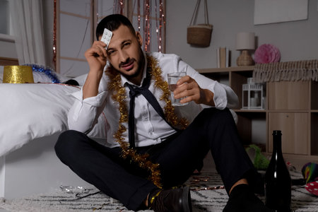 Man with glass of alcohol suffering from hangover on floor in messy room after party
