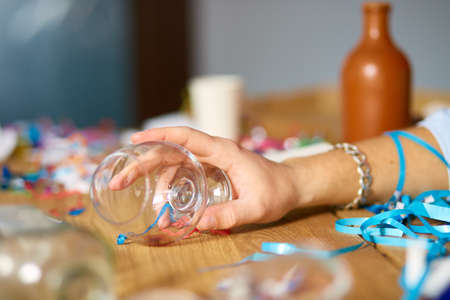 Close up of hand man hold a glass of brandy, sleeping at table in messy room after bachelor party, tired man after party at home