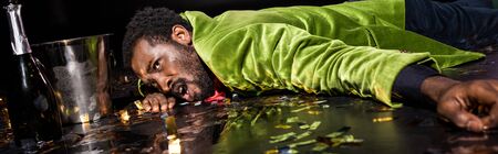Panoramic shot of drunk African American man lying on floor with shiny confetti near ice bucket and bottle of champagne on black background