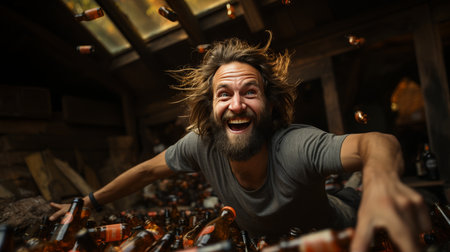 Happy bearded man with alcohol addiction. lots of bottles and waste around.