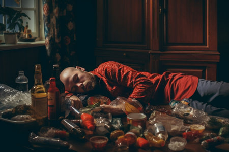 Banner of Bearded man sleeping at table in messy room after bachelor party, tired man after party at home