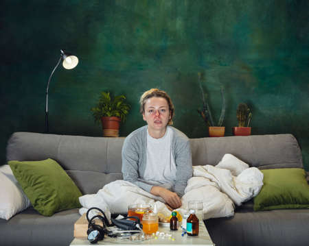 A young man suffers from a cold at home with tea and lemon wrapped in warm clothes or a blanket. He is holding his head and has a high fever.