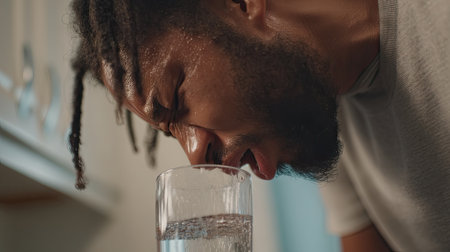 A man experiences a moment of struggle while drinking water from a glass in a kitchen. His facial expression reveals determination and need for hydration, capturing a relatable human experience.