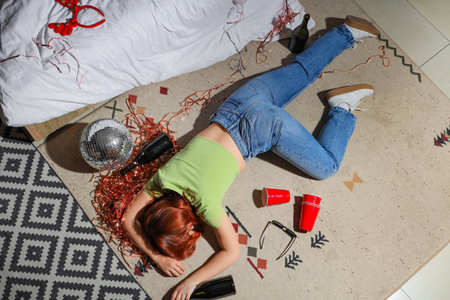 Drunk young woman sleeping on carpet in bedroom after party, top view