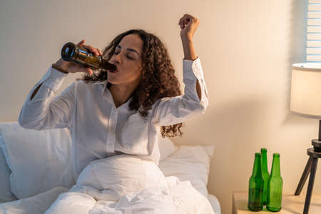 Drunk Latino woman hold beer bottle, feel hangover and dancing on bed. Young beautiful happy female stting in dark night in bedroom, feel alone and celebrate life problem with alcohol party at house.