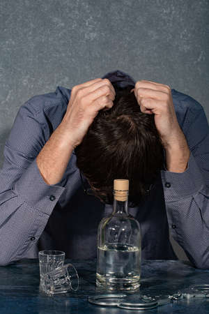 The man is angry and has problems with alcohol, there are a lot of empty glass bottles around