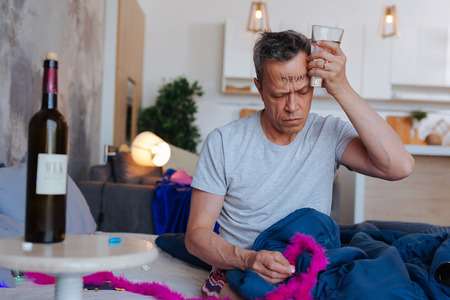 Morning headache. Upset mature man holding water and closing eyes