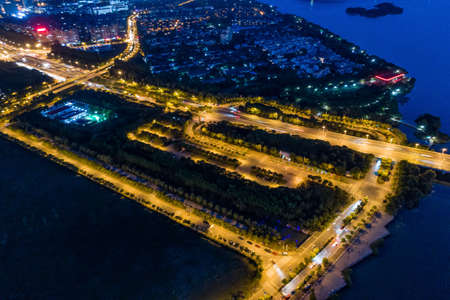 Aerial photography of the city scenery of Yuehu Park, Ningbo, Zhejiang