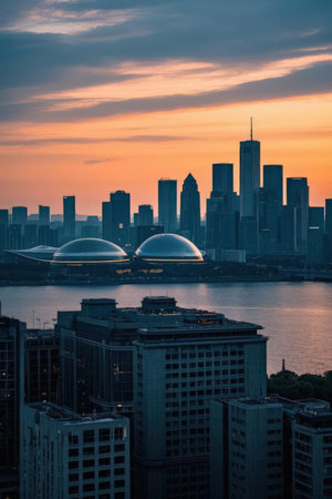 Sunset of Minjiang river and cityscape in fuzhou,China
