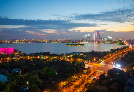 Suzhou Jinji Lake urban landmark twilight scenery, China