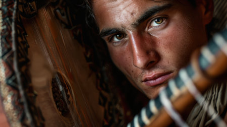 A close-up portrait of a young Araucanian male musician