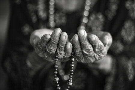 Soulful prayer: a man in quiet devotion, hands clasped around a rosary cross, seeking solace and spiritual connection, capturing the essence of serene contemplation, faith, and religious devotion