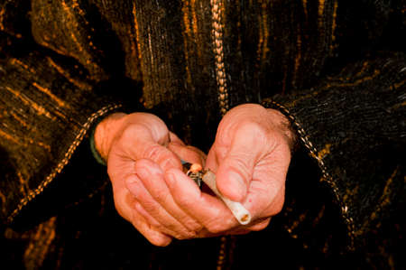man hands with dark green djellaba, cigar in hand, prepares hashish cigar with white smoking paper, hashish cigar preparation