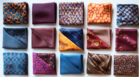 A vibrant assortment of folded fabric swatches featuring diverse patterns and textures. Ideal for fashion designers and artists seeking inspiration.