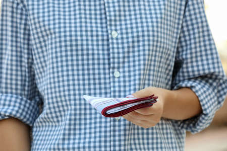 A close-up view of a well-groomed hand holding a stylish handkerchief, showcasing elegance in a formal suit. Perfect for themes of fashion and sophistication.
