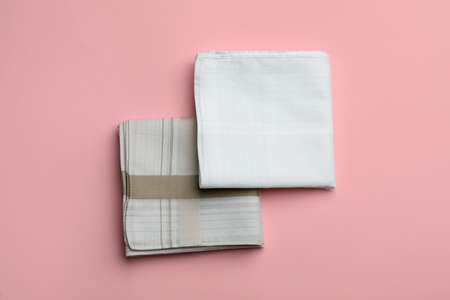Stylish handkerchiefs on pink background, flat lay. Space for text