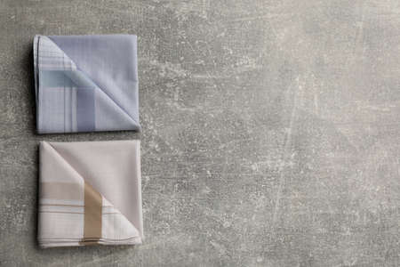 Stylish handkerchiefs on light gray table, flat lay. Space for text