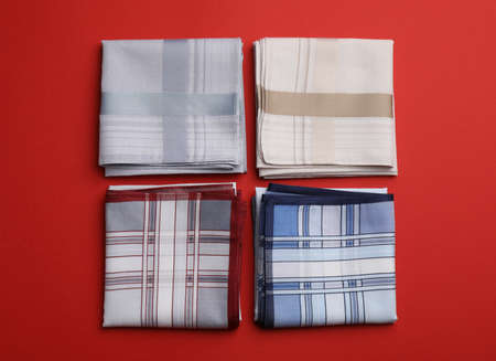 Different stylish fabric handkerchiefs on red background, flat lay. Space for text