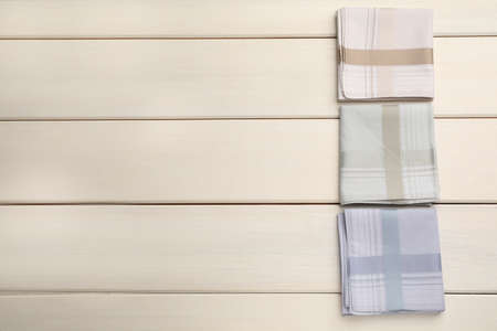 Stylish handkerchiefs on white wooden table, flat lay. Space for text