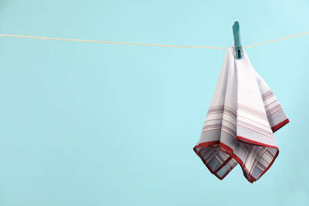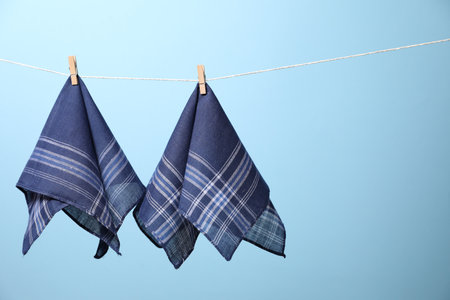 Beautiful cotton handkerchiefs hanging on string against light blue background. Space for text