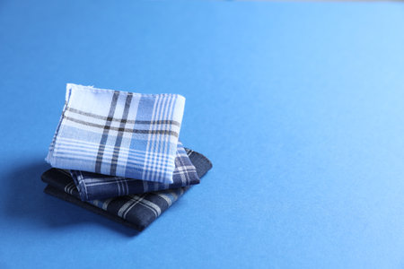 Different stylish fabric handkerchiefs on blue background, closeup. Space for text
