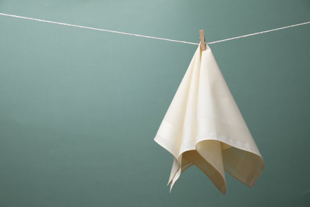 Stylish handkerchief hanging from string against pale green background. Space for text