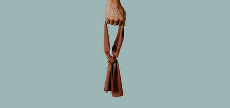 man holding a brown blindfold in his hand on a pale gray background, playing with the concept that justice must be blind, in a panoramic format to use as web banner