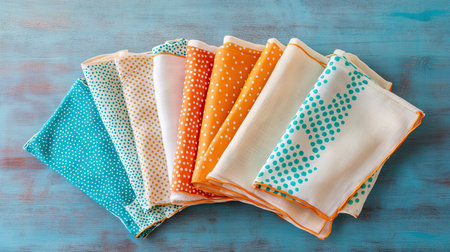 A vibrant arrangement of fabric napkins in shades of blue, orange, and white is displayed on a textured blue wooden surface. Perfect for home dining.
