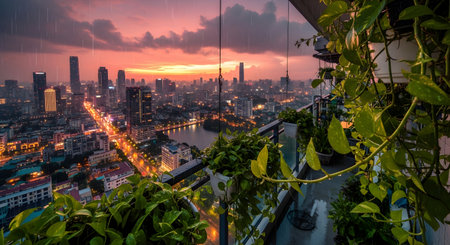 A stunning aerial view captures the sunset over a vibrant city skyline blending colors and architectural beauty.