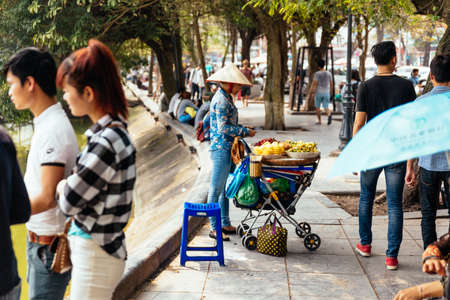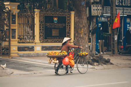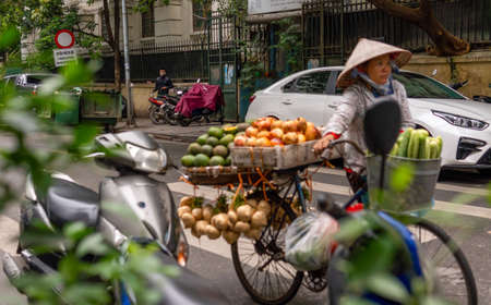 Hanoi, Vietnam - November 13,2019 : Asian woman walking bike, fruit vendor