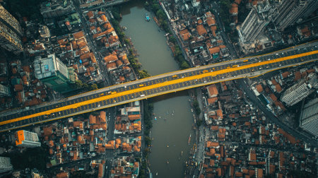 An aerial view of a bridge with yellow traffic lines stretching over a river, surrounded by a dense urban landscape