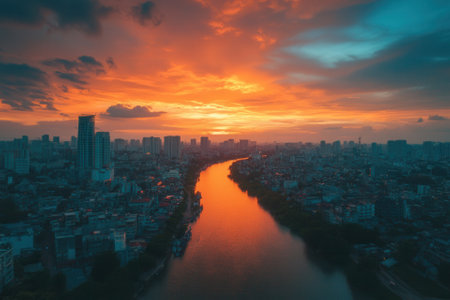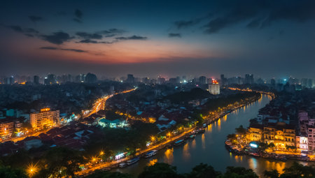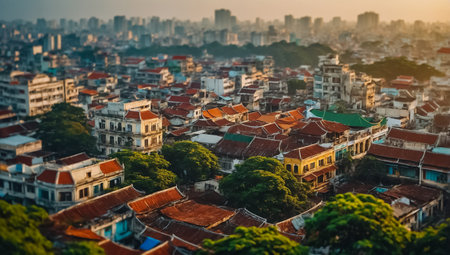 Stunning panoramic view of Hanoi's skyline at sunset, showcasing the city's vibrant architecture and tranquil atmosphere. A perfect image for travel enthusiasts.