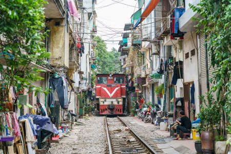 Local houses located close to active railway in Hanoi Old Quarter, Vietnam.