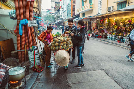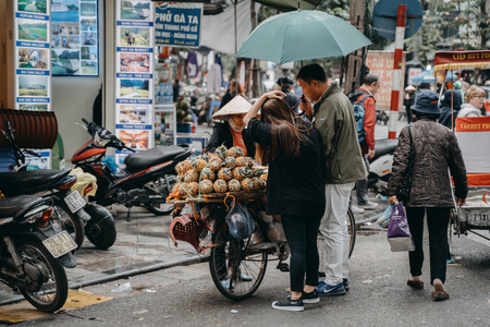 Hanoi, Vietnam, 12.20.18: Life in the street in Hanoi. Vendors try to sell their goods in the busy streets of Hanoi