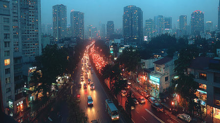 A captivating cityscape at dusk, showcasing a busy road with car lights and tall buildings in the background. The scene is illuminated by street lights and building lights.