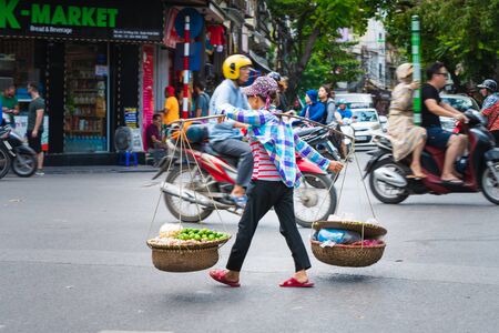 Hanoi, Vietnam - 11th October 2019: Asian woman with a wooden carrying pole transporting goods across a busy road in Hanoi, Asia