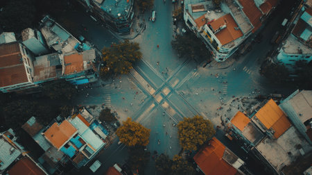 This aerial image showcases a vibrant urban intersection with people and vehicles harmoniously navigating the streets, offering a glimpse into lively city life.