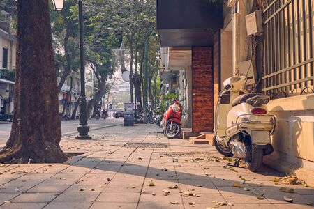 A street at sunset in the city of Hanoi, motorbikes stand on the sidewalk and mopeds pass along the road, the warm sun shines