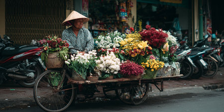 Vietnamese woman selling flowers on the street.