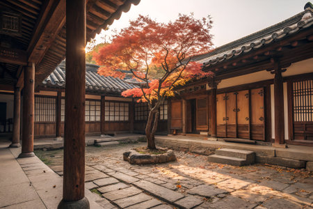 Korean traditional architecture in Seoul, South Korea. Old town with red maple tree.