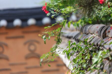Bukchon Hanok Village, pink rose flowers and brick wall in Seoul, Korea